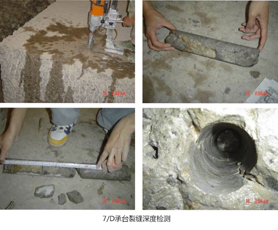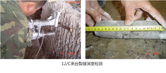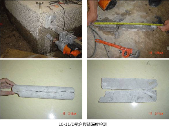 5、根据裂缝深度检测结果推断:①由于二次浇筑导致的施工冷缝基本贯通。②由于其他原因导致的裂缝深度基本在200-400mm范围之内。基础桩承台的裂缝宽度参看中国矿业大学的检测结果。