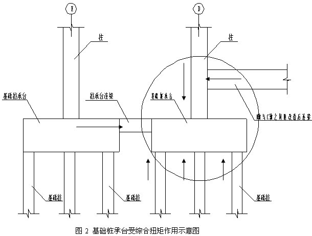 综上所述,在图2所示的圆形区域内,由箭头所示的各项荷载及建筑物修建初期,地基沉降在各构件内部产生的应力平衡和调整,使图示圆形区域内桩的基础平台受到复杂的扭矩作用,加上施工原因造成的施工缝对基础桩平台抗剪切能力的削弱,使该部分桩承台产生非常规的裂缝出现。