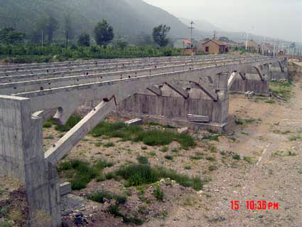 1、工程概况:此桥为三跨刚架拱桥,拱片、拱腿、斜撑为预制钢筋混凝土构件,混凝土设计强度为C30。大桥总长79.89米,总宽18.5米,其中车行道16米,两侧各1.25米人行道。