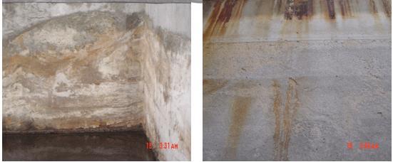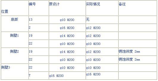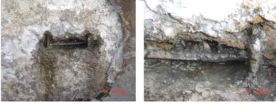 另外,池壁防水砂浆层有空鼓现象,局部已脱落。敲开空鼓处,下层混凝土已经粉末化,粉末化深度5 -20mm . 局部混凝土完全被侵蚀,内部形成贯通空洞,洞中存留酸性液体,钢筋浸于其中已严重锈蚀。