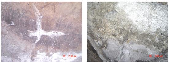 2)、按照原设计图纸主体结构采用掺加明矾石膨胀剂的防水混凝土,在膨胀剂搅拌不均匀时造成局部混凝土开裂,出现裂缝后在酸性介质的腐蚀下进一步破坏, 从而使结构强度降低,局部混凝土甚至粉末化失去强度和没有了承载能力。