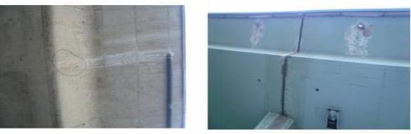 3)、池壁防水砂浆层破坏,并分布有多条垂直裂缝,裂缝长度2 -3米 ,宽0.2 -0.8mm 由池顶向池底方向延伸。
