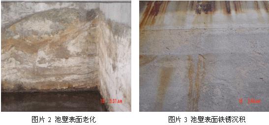 2.该构筑物池壁表面粗糙,老化,沉积铁锈,具体表现从下面的图片所示。