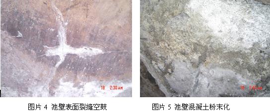 另外,池壁防水砂浆层有空鼓现象,局部已脱落。敲开空鼓处,下层混凝土已经粉末化,粉末化深度5-20mm. 局部混凝土完全被侵蚀,内部形成贯通空洞,洞中存留酸性液体,钢筋浸于其中已严重锈蚀。