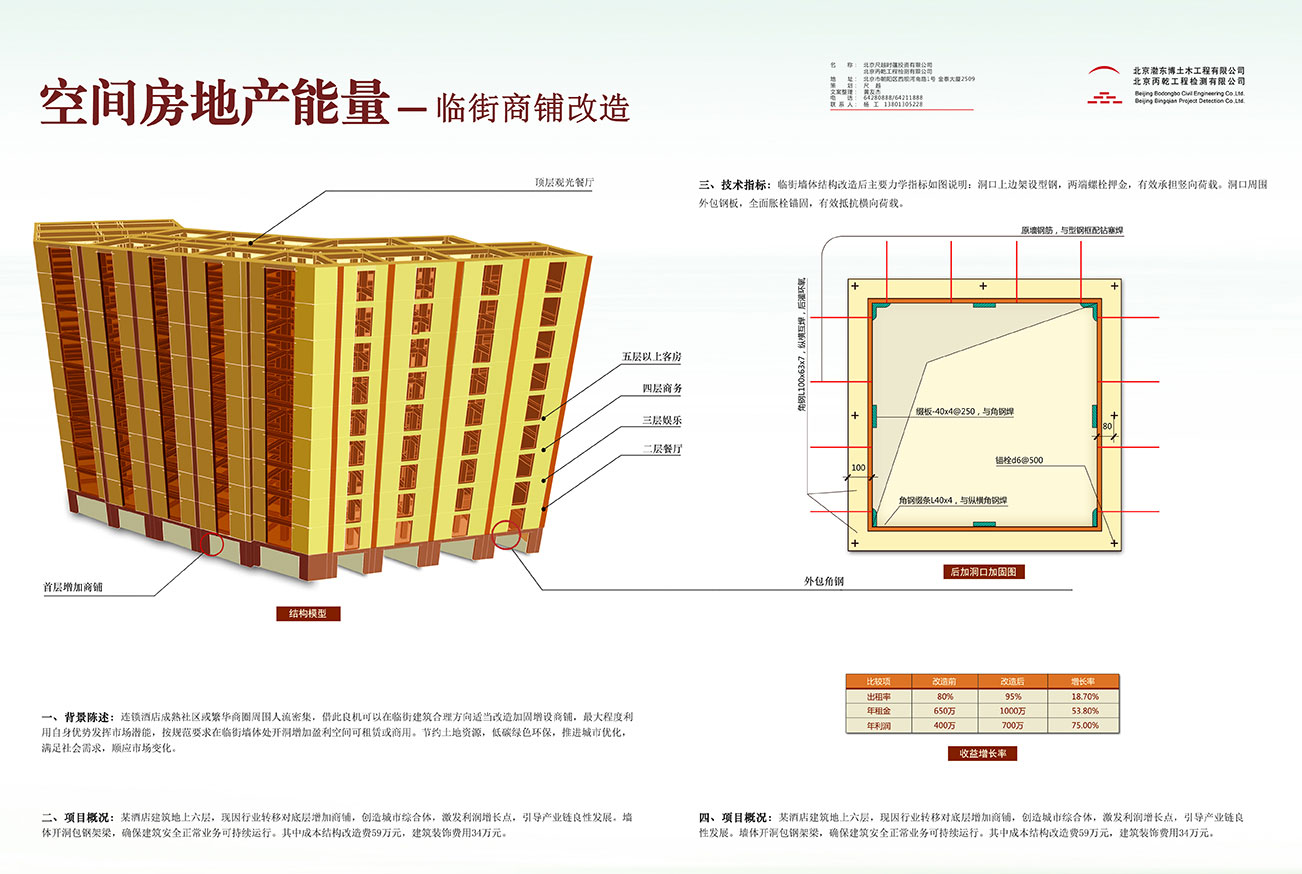 四、项目概况:某酒店建筑地上六层,现因行业转移对底层增加商铺,创造城市综合体,激发利润增长点,引导产业链良性发展。墙体开洞创钢架梁。确保建筑安全正常业务可持续运行。其中成本结构改造费59万元。建筑装饰费用34万元。