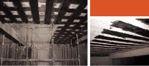 2004 年,我公司对无锡扬子江大厦进行改造加固。该建筑闲置七年,属于“烂尾楼建筑”。技术人员赴现场检测发现钢筋出现锈胀,加上原设计存在一定缺陷,改造加固的难度非常大。设计人员又根据甲方需求,在建筑中心位置设计一个天井并拔掉中心位置的中心柱,这样地基反力势必增大,节点位置荷载的突变对结构整体影响很大,对于这座闲置七年之久的烂尾楼,实际操作起来非常不容易,我们用CFRP 补强等技术对结构进行处理,最终完成了这次任务。